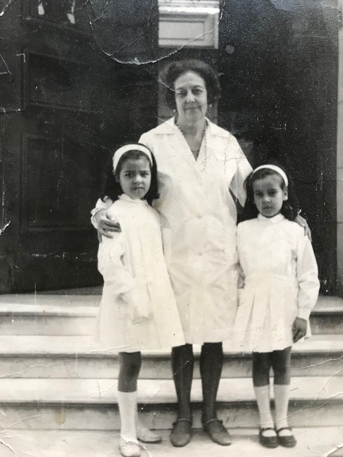 La Ieia comenzó a trabajar como docente en Buenos Aires. La primera escuela que recuerdo es una que estaba en Liniers (Escuela Santa Cruz), al lado de la conocida Iglesia de San Cayetano. Ahí, ella era Vicedirectora. Cuando nos tocó empezar la escuela con mi hermana María Alejandra (bautizada por mí como Maita), allí marchamos. Siempre supimos que no seríamos “acomodadas” a pesar de ser las nietas de la vicedirectora. La Ieia tenía estándares altos. Aunque tuviéramos solo 5 y 6 años y fuéramos sus nietas, al hablar con ella en público en la escuela, le decíamos “señora vicedirectora”. Agrego una foto de la Ieia, Ale y yo en la puerta de esa querida primera escuela y una foto de mi boletín escolar de primer grado donde la Ieia firma como Directora.